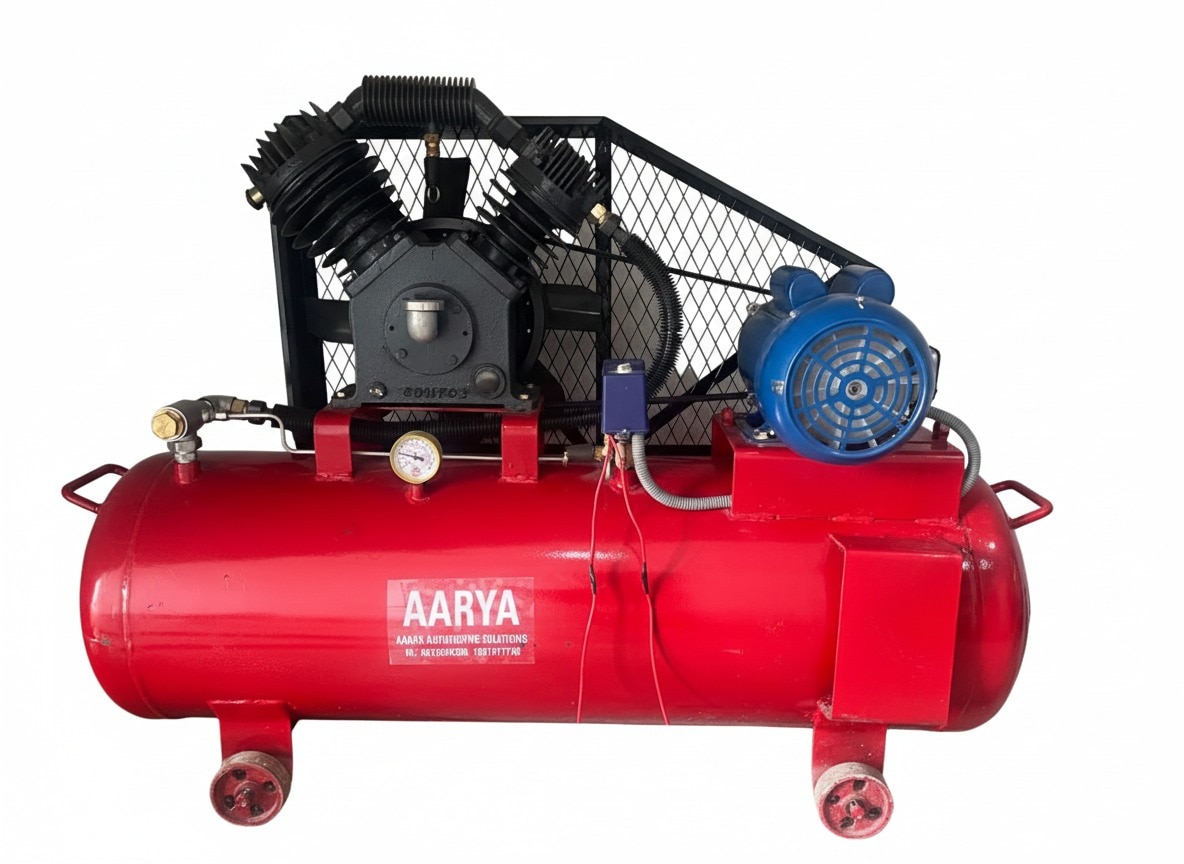 Two staged air cooled industrial air compressor - used to operate pneumatic tools, also for tire inflation & air. The air compressor is equipped with auto-cut system, flywheel, belt filter, electric motor, safety valve, V belts motor pulley, belt guard with drain valve & pressure guage cleaning. SPECIFICATIONS No. of Cylinders HP Displacement Working Pressure Comp.RP M Tank Capacity (Litres) LPM CFM M/HR Kg/Cm PSI 2 3 303 10.7 18.2 12 175 925 225